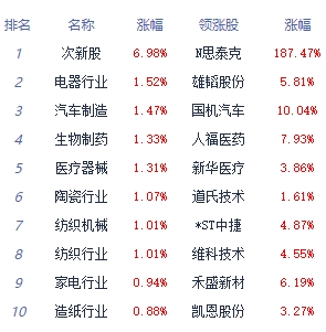 板块方面,汽车整车、汽车零部件、贸易、厨卫电器等板块领涨,非金属材料、房地产开发、通信服务、机场航运等板块走低。