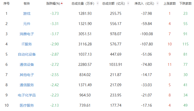 板块方面,风电设备、化学纤维、农化制品等板块涨幅居前,游戏、元件、消费电子等板块跌幅居前。